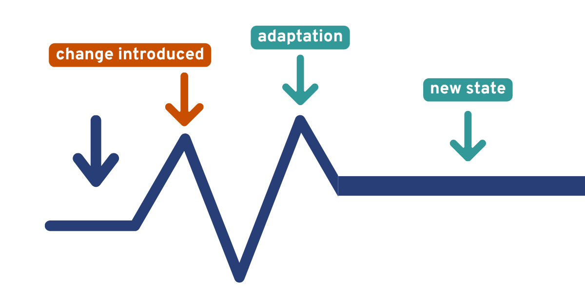 Implementing such strategies can help react to the effects of the implementation dip quicker and more effectively. Teams can decrease the temporary drop in performance and eventually surpass the original performance level (new state), hence, improving after adapting change.