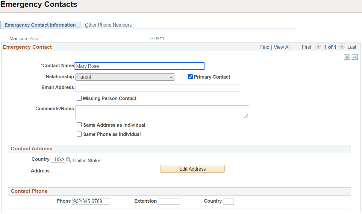 The new fields are also delivered on the administrative Emergency Contact Information page. The fields can be set to required, re-labelled, and masked or hidden using Page and Field Configurator.