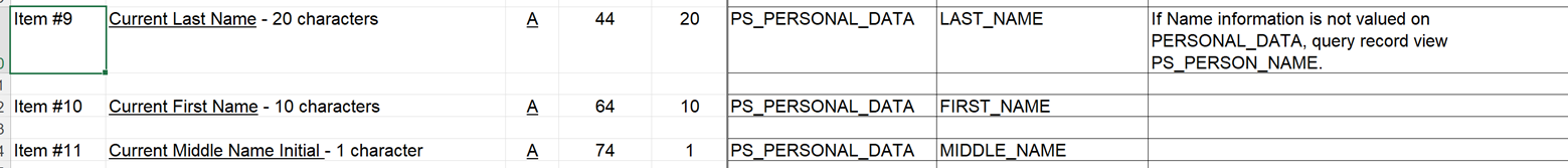 PeopleSoft record and field, field position in record, data type and size, vendor record, vendor field, vendor field position in record if available, vendor screen where data appears, PeopleSoft business logic that used to populate the field.