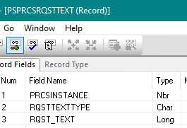 I am trying to identify the record where Distribution Detail is stored. This is what you get when you are about to start a process, and on the Process Scheduler Request page press the Distribution link. I'm interested in the Email Subject, Message Text, Email Address List and Distribution ID. It looks like it should be a combination of PRCSRQSTDLG and PRCSDEFNDIST_VW, however when I asked for access to PRCSRQSTDLG I was told that it doesn't exist, while