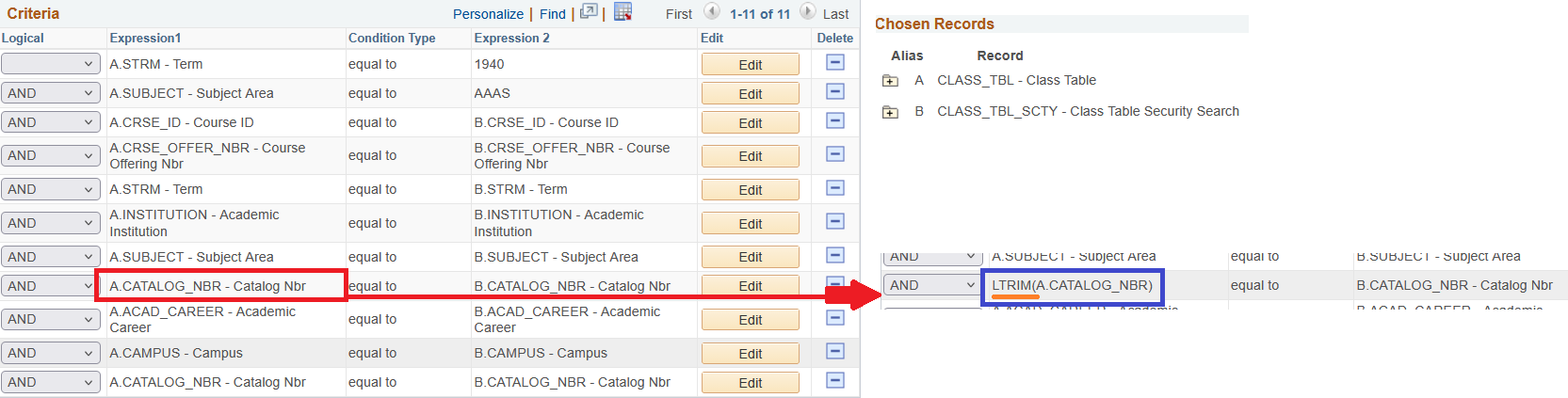 When I modify the criteria PS Query manager defaults to in joining this table to the CLASS_TBL record (A.CATALOG_NBR equal to B.CATALOG_NBR), which produces zero results, to one replacing A.CATALOG_NBR with the expression "LTRM(A.CATALOG_NBR)" a la the SQL above, I get the expected results: