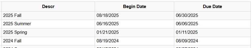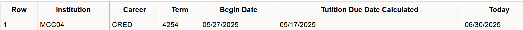 SELECT DISTINCT A.INSTITUTION, A.ACAD_CAREER, A.STRM, TO_CHAR(A.TERM_BEGIN_DT,'YYYY-MM-DD'), ((TO_DATE(TO_CHAR(A.TERM_BEGIN_DT,'YYYY-MM-DD'),'YYYY-MM-DD')) + ( -10)), TO_DATE(TO_CHAR(SYSDATE,'YYYY-MM-DD'),'YYYY-MM-DD') FROM PS_TERM_TBL A WHERE ( A.INSTITUTION = :1 AND A.ACAD_CAREER = :2 AND A.STRM = :3) GROUP BY A.INSTITUTION, A.ACAD_CAREER, A.STRM, A.TERM_BEGIN_DT, TO_DATE(TO_CHAR(SYSDATE,'YYYY-MM-DD'),'YYYY-MM-DD')
