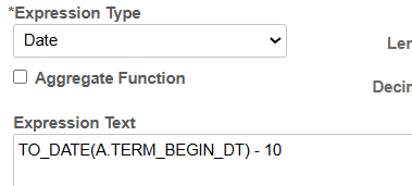To calculate the "due date" as 10 days prior to the TERM_BEGIN_DT (use field as CALC_DUE_DT in Expression): %DateAdd(%datein(A.TERM_BEGIN_DT), -10)