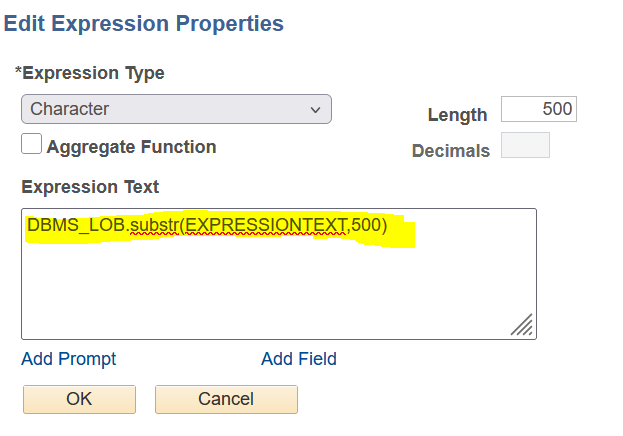SELECT A.QRYNAME, TO_CHAR(SUBSTR(TRIM( C.EXPRESSIONTEXT),1,2048)), B.SELNUM, B.FLDNUM